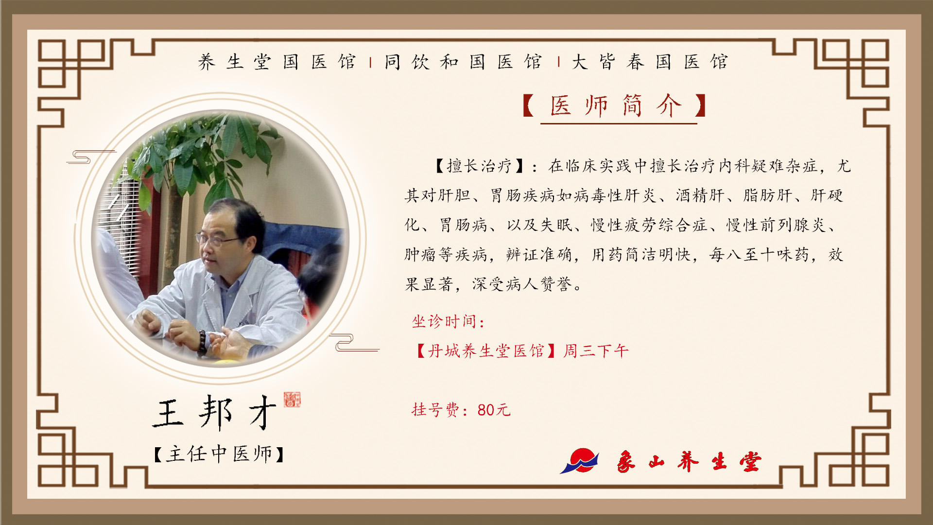 2021年9月1日(星期三)起王邦才教授定期坐诊地点更改为养生堂同饮和国医馆,请相互告知。 坐诊地址:丹城天安路110号二楼 咨询电话:0574-59122213/59122215